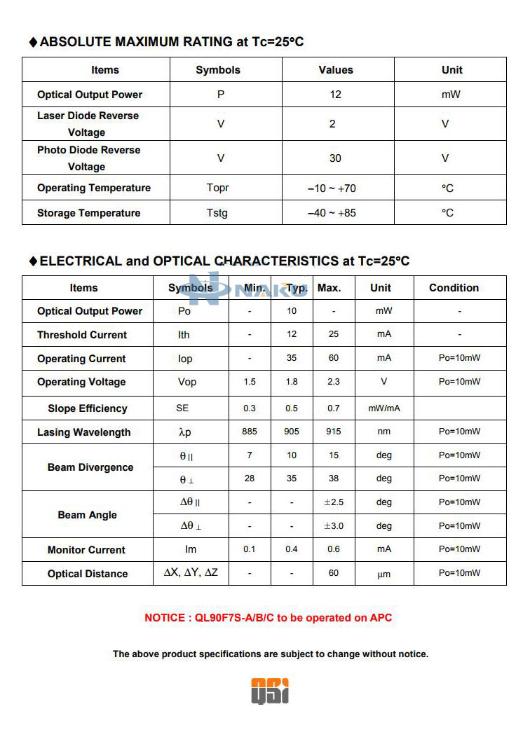QL90F7S-A/B/C is a MOCVD grown 905nm band InGaAs laser diode with quantum well structure. It’s an attractive light source, with a typical light output power of 10mW for Laser, industrial optical module and sensor application